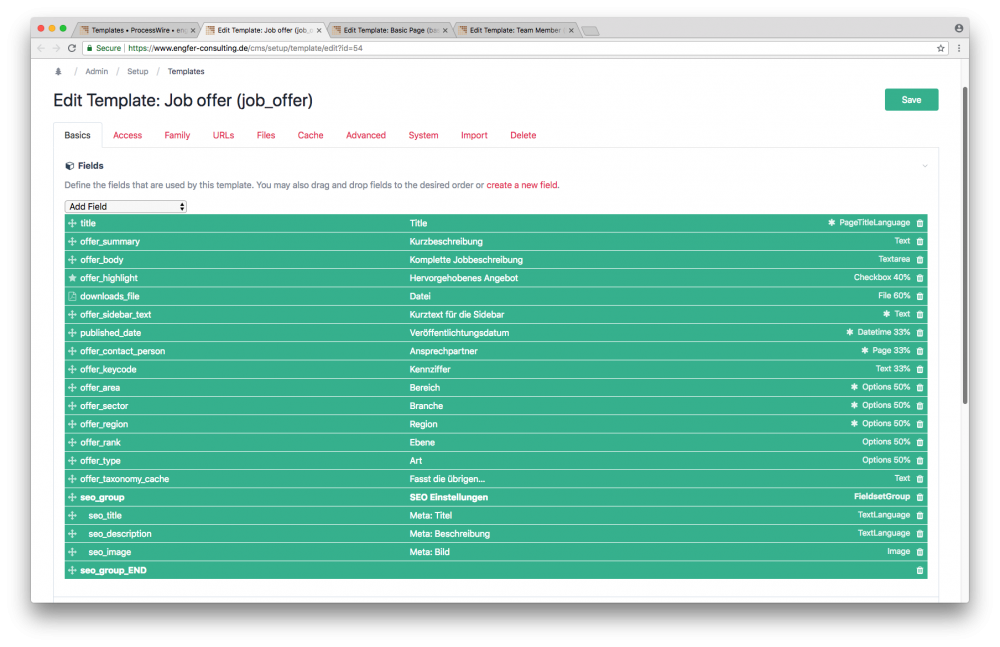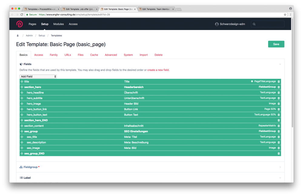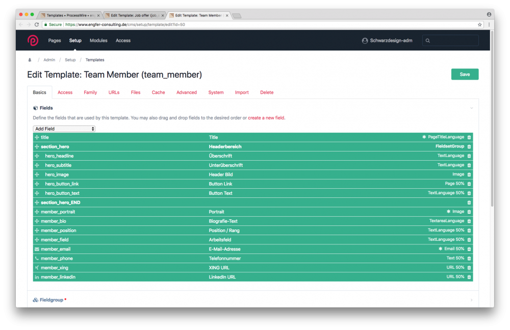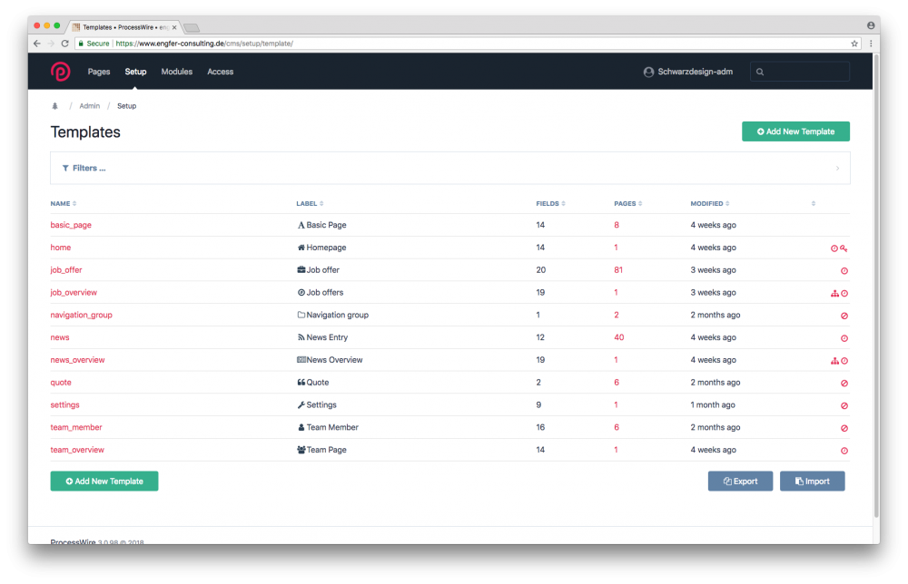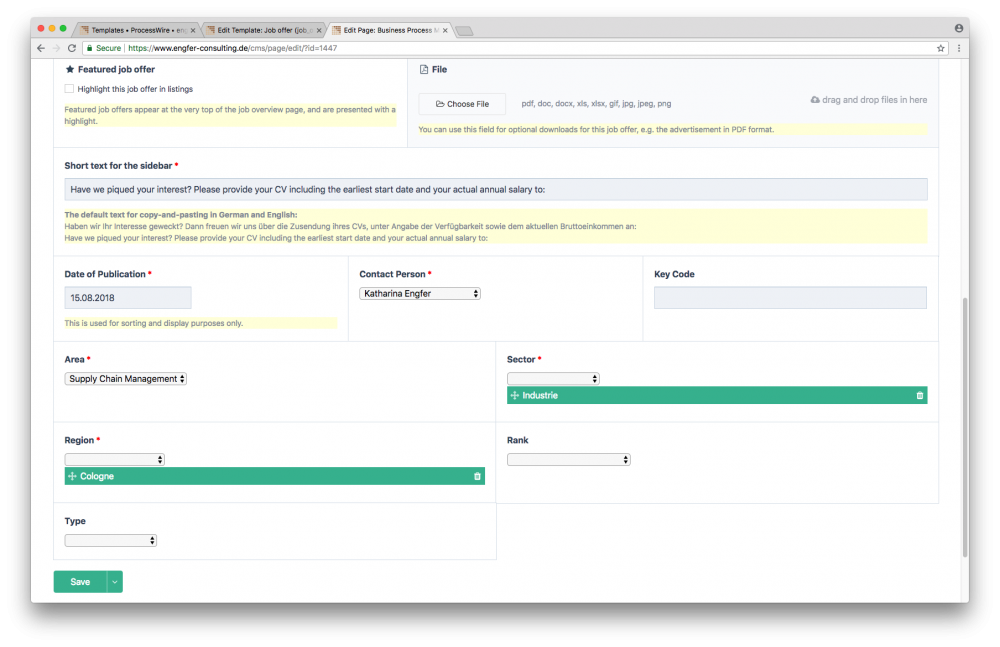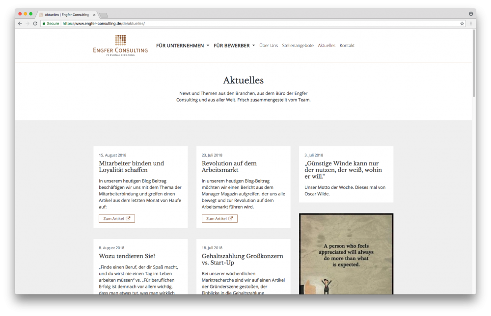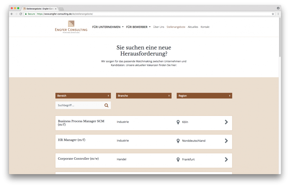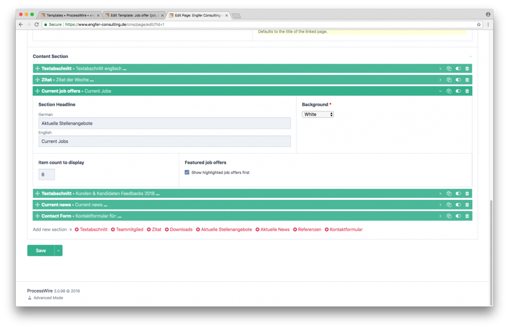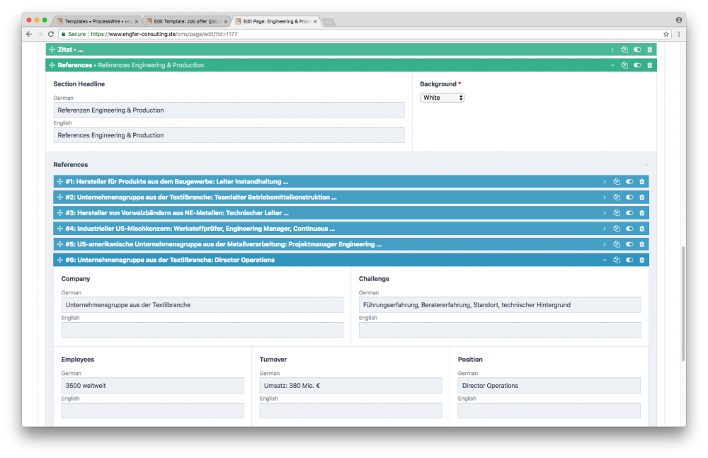 We recently finished a relaunch of the website of the consulting firm Engfer Consulting: engfer-consulting.de. Built with ProcessWire 3 and Bootstrap 4. Features Bilingual website (UPDATE: The English page is now available! the English page is inactive at the moment, as the content is not ready yet) A strong, simple data structure for job offers and news, allowing for a custom search page and fulltext search Sectioned content-blocks built with a Repeater Matrix (ProFields) Reusable components available as page reference fields Automatic generation of open graph-tags, with manual overrides available on each page Contact forms with a custom recipient depending on the current page Modules used: ProFields ProForms Sitemap Cookie Management Banner Duplicator Tracy Debugger Wire Mail SMTP Admin Links in FrontEnd Technical insights Most of the content is built using a Repeater Matrix field. Each section has an optional heading and a select-field for background colors. Some of the sections available include: Text blocks (a repeater-field for multi-column text) Feeds / listing of the latest job offers or news (with a field to control the number of entries shown) Displaying a team member or quote (selected through a page reference field) Downloadable files (a multivalue field for file uploads) Those sections can be combined and stringed together arbitrarily, so any number of page templates showing different contents can be built. The job offers template, in contrast, features fixed fields for taxonomy assignment, description, contact person, preview image and so on, making the job offer pages uniform and easily accesible. The (technically) most interesting part of the site is the job overview page, which contains custom filters that are automatically generated from the available taxonomy terms. The stylesheets are written in SASS, built with Bootstrap 4. Only the base and grid SASS files of Bootstrap are included, along with the Bootstrap components that we ended up using. Using Bootstrap 4 as a framework in this way makes development & styling blazingly fast, once all the utility classes are commited to muscle memory ... > Our Agency. Screenshots