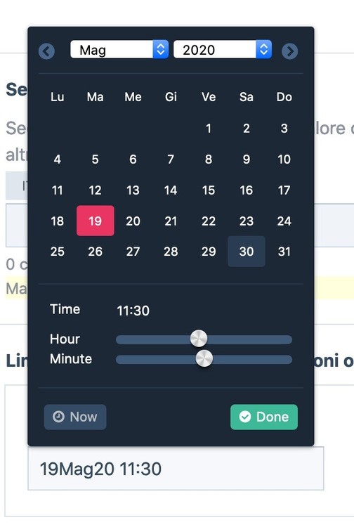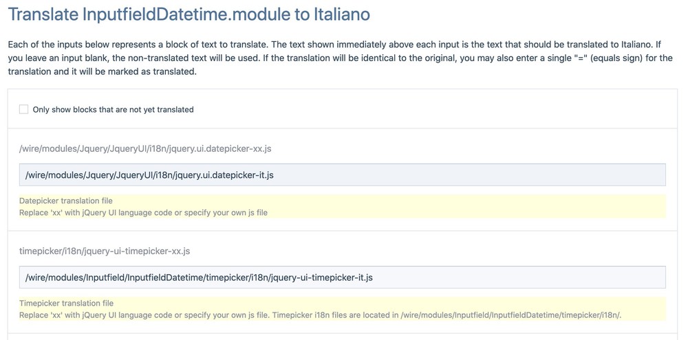 Hi everybody, First time for me here to ask an help. So I apologize in advance for any section mistakes or forum rules not respected. I'm a newbie in PW, only 1 year working on it. I have a page with Date/Time pickers and they work perfectly, but I should have those in Italian (for safe editors that aren't so good with English). So I followed the translation suggestions founded in some old posts. Once setted the correct URL, the DatePicker are displayed in the right language, but I have an error on page saving: it seems that the field doesn't register the date/time change from the older language. The same problem occurs if I create a new page, not only changing the old ones. May I have missed something? Thanks a lot in advance.