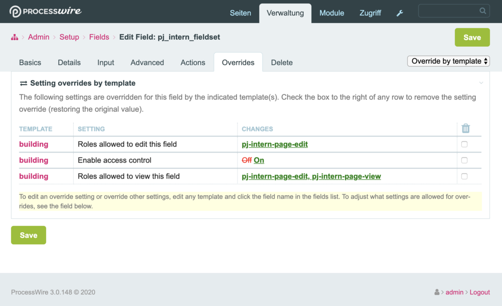 Hello, for a project I have pages with different “content areas“ that can be edited only by specific user roles. In the past I setup a fieldset (tab) containing all the fields that should be available to only one specific group of users and set the fields' view and edit permissions (in the Access tab) accordingly. The result was as expected: Users assigned to the specific role could see the tab, click on it, edit content, users without the role could not see the tab. After updating this installation to 3.0.148 yesterday I wanted to setup another tab following the same principle, but I have no "Access" tab for the fieldset to limit access to the specific role. I even tried cloning an existing (and still working) fieldset. The existing fieldset has some template overrides (screenshot attached) that lead to the desired behaviour, but I am not able to reproduce these settings because there is not "Access" tab for my fieldset in template context either. Is this a bug in 3.0.148? Has the fieldset fieldtype changed? Am I missing anything here? I am glad to hear from you guys. Cheers, Flo