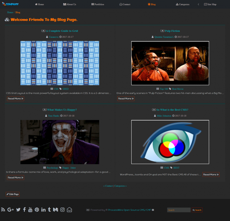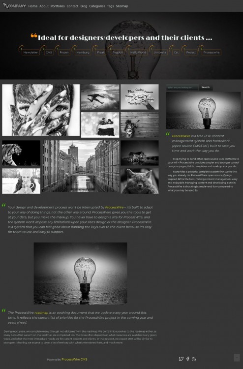 This profile can be used as a simple business card or blog. The profile does not use any framework css structure, only styles based on CSS GRID and FLEX. To minimize page loading, I added lazy load for images ( Tupola Lazy Load ). With include functions like: MarkupRegions FunctionsAPI CAN DOWNLOAD FROM THIS LINK: https://github.com/rafaoski/site-grayscale-pw https://github.com/rafaoski/site-min-grayscale-pw Screenshot:
