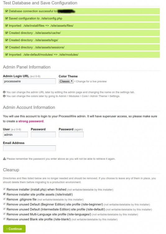 I'm not sure that I really follow this page; http://imgur.com/a/hCxqg I've created a database when setting up the server, so I'm presuming that this is what's being asked for here? The page linked for getting setup http://webdesign.tutsplus.com/tutorials/how-to-install-and-setup-processwire-cms--cms-25509 doesn't really mention anything about these fields. After trying to use the user name on the server, and the password that I entered when setting up the mySQL to start with I got the following error (so I had filled in "DB Name"={some name that I thought up }, "DB user" = {name of user on server}, "DB pass" = {pass i set up for mySQL}); http://imgur.com/a/cgFKq After this i tried using db name; {whatever} db user; {name of user on server} db pass; {password for user on server} This didn't work either, so I'm not sure what I'm meant to put here.