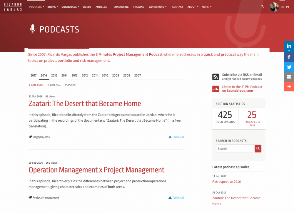 Hi guys, after several months I finally released my most complex ProcessWire project so far: https://ricardo-vargas.com About the client: Ricardo Vargas is a specialist in project management and strategy implementation. He's an accredited professional and author of several books. Since 2007, he publishes a bilingual podcast about project management with millions of episodes listened. From 2012 to 2016, he worked for the United Nations Office for Project Services (UNOPS) in Copenhagen, Denmark. He currently lives in Portugal. The previous site was developed in 2009 using Wordpress by my team at the agency I was working for. In 2011, Ricardo invited me to work with him and I started to maintain the site ever since. The front-end side was good, performance-wise, but the backend started to become horrendous to work with so in 2012 I started my quest to find a better CMS and found PW. After developing small projects and messing around with it I convinced my client/boss last year to let me develop his new website with PW. I did all the stuff (design, frontend, backend, and server ops) so if you find something buggy or strange, let me know, please! I'll appreciate! The site is currently running on Digital Ocean droplet with 2GB of RAM. Nginx and Cloudflare (for SSL mostly). I'm using forge.laravel.com to manage it. Approx. 3,000 unique users per day doing 72,421 requests (Cloudflare stats). Key features: Pages are loaded with ajax using https://github.com/miguel-perez/smoothState.js so the podcast player (Soundmanager ) can continue to play the podcast episode as the user navigates other pages. Member area where the user can see the books his own (and download their files) and also see his bookmarks and reports. I imported and the users (+ 4k) from the WP database and decided to get rid of passwords (the future!) so after some research and tests, I chose Auth0 login system. I've mentioned the member area on this topic (there are a couple of screenshots there): Modules used AdminLinksInFrontend AdminOnSteroids AdminTemplateColumns Auth0Login (Custom made) BatchChildEditor ClearCacheAdmin FieldtypeRuntimeMarkup FlickrAPI (Custom made) FormBuilder InputfieldCKEditor MarkInPageTree MarkupLoadRSS PageReferencesTab PageViews (Custom made) PduReport (Custom made) PrevNextTabs ProCache ProDrafts ProcessDatabaseBackups ProcessJumplinks ProcessSendyAPI (Custom made) ProcessWireUpgrade ReaderAreaManager (Custom made) SlideshareAPI (Custom made) TemplateLatteReplace TextformatterAccordion TextformatterHannaCode TextformatterMarkExternalLinks TextformatterMultiValue TracyDebugger UserBookmarks (Custom made) WireMailMailgun importPagesCSV