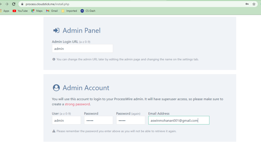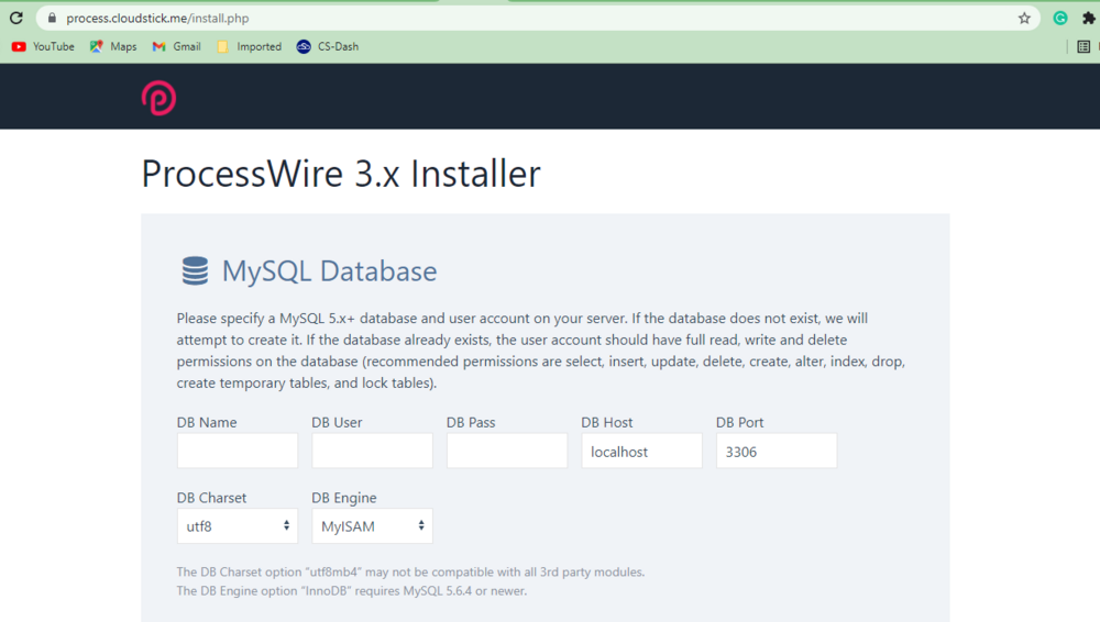 I'm not sure that I really follow this page; http://imgur.com/a/hCxqg I've created a database when setting up the server, so I'm presuming that this is what's being asked for here? The page linked for getting setup http://webdesign.tutsplus.com/tutorials/how-to-install-and-setup-processwire-cms--cms-25509 doesn't really mention anything about these fields. After trying to use the user name on the server, and the password that I entered when setting up the mySQL to start with I got the following error (so I had filled in "DB Name"={some name that I thought up }, "DB user" = {name of user on server}, "DB pass" = {pass i set up for mySQL}); http://imgur.com/a/cgFKq After this i tried using db name; {whatever} db user; {name of user on server} db pass; {password for user on server} This didn't work either, so I'm not sure what I'm meant to put here.