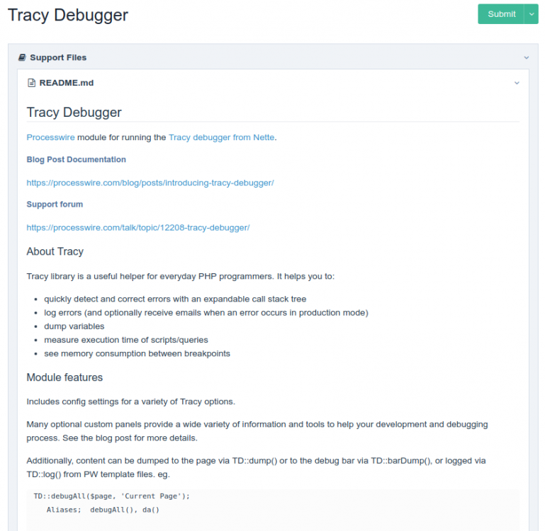 Part 1 of a 2 part Module & Service Reveal. I'm currently working on a new module: ModuleReleaseNotes that was inspired by the work I originally did on making Ryan's ProcessWireUpgrades module "release" aware. In the end, I decided to ditch the approach I was originally taking and instead work on a module that hooked in to the UpgradeConfirmation dialog and the module edit page. Aims My aims for this module are as follows... Make discovery of a module's changes prior to an upgrade a trivial task. Make breaking changes very obvious. Make reading of a module's support documentation post-install a trivial task. Make module authors start to think about how they can improve the change discovery process for their modules. Make sure the display of information from the module support files/commit messages doesn't introduce a vulnerability. Looking at these in turn... Making discovery of a module's changes prior to upgrade a trivial task. This is done by adding a "What's changed section" to the upgrade confirmation dialog. This section takes a best-effort approach to showing what's changed between the installed version and the updated version that's available via the module repository. At present, it is only able to talk to github-hosted repositories in order to ask them for the release notes, the changelog file (if present) and a list of commits between the git tag that matches the installed version and the tag matching the latest version. It will display the Release Notes (if the author is using the feature), else it will display the commits between the tags (if tagging is used by the module author) else it will show the changelog file (if present) else it will show the latest N commits on the master branch (N, of course, being configurable to your liking.) An example of the Github Release Notes pulled in for you, taken from Mike Rockett's TextformatterTypographer Module... An example of a tag-to-tag commit list from the same module... An example of a changelog - formatted to show just the changes (formatting styles will change)... Finally, an example of a fallback list of commits - sorry Adrian ... Making breaking changes obvious. This is currently done by searching for a set of configurable search strings. Later versions may be able to support breaking change detection via use of Semantic Versioning - but this may require some way of signalling the use of this versioning standard on a module-by-module basis. For now, then, you can customise the default set of change markers. Here I have added my own alias to the list of breaking change markers and the changes section of the changelog is styled accordingly (these will be improved)... Make reading of a module's support documentation, post-install, a trivial task. This is done by making some of the support files (like the README, CHANGELOG and LICENSE files) readable from the module's information/settings screen. There is an option to control the initial open/closed state of this section... Here is Tracy's README file from within the module settings page... Make module authors start to think about how they can improve the change discovery process for their modules. There are notes in each of the sections displayed on the upgrade confirmation page that help authors use each of the features... Make sure display of external information doesn't introduce a vulnerability. This is an ongoing concern, and is the thing that is most likely to delay or prevent this module's release lead to this module's withdrawl should a vulnerability be found. Currently, output is formatted either via Markdown + HTML Purifier (if it was originally a Markdown file) or via htmlspecialchars() if it has come from a plaintext file. If you discover a vulnerability, please get in contact with me via the forum PM system. Ongoing... For now, I've concentrated on integration with GitHub, as most people use that platform to host their code. I know a few people are hosting their repositories with BitBucket (PWFoo comes to mind) and some with GitLab (Mike Rockett?) and I would eventually like to have adaptor implementations for these providers (and perhaps GitKraken) - but for now, GitHub rules and the other hosts are unsupported. Links Github: ModuleReleaseNotes PW Module Repository: Here