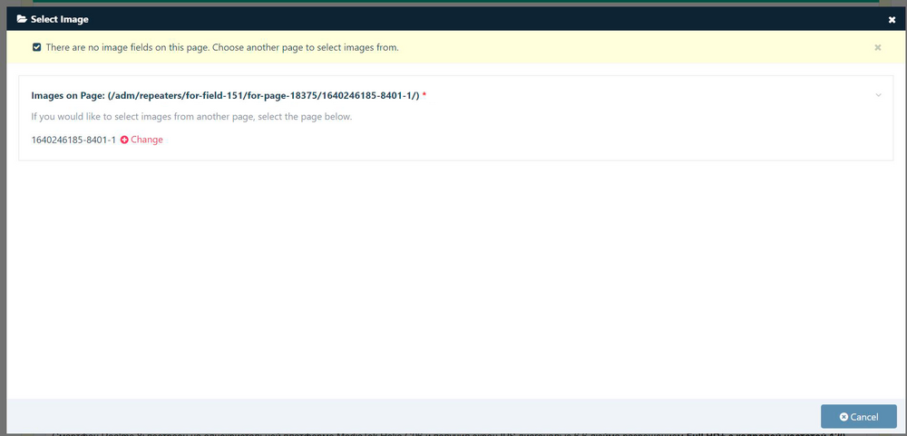 Hi Everybody. I have the issue with image button in CKEditor (PWimage plugin) after upgrade from PW 3.0.165 to PW 3.0.184. When i click in image button in CKEditor in the repeated field is open modal window with strange information and proposition to choose the page for use images. Like on the screenshot. With the text: There are no image fields on this page. Choose another page to select images from. But when i click the same button in CKeditor but in the ordinary textarea (not repeated) field it works fine and opens modal window with images linked with this page Is anybody know about this issue solution? Thanx.