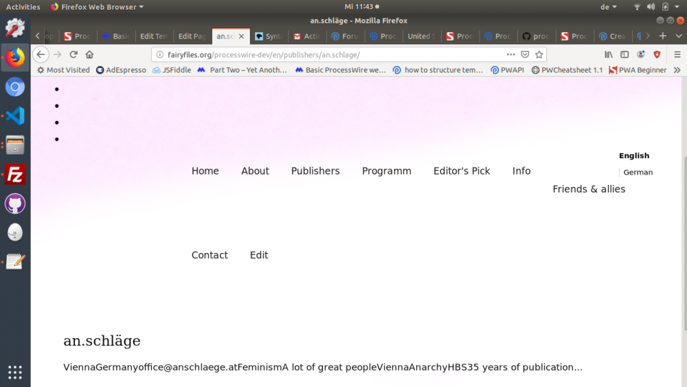 Hello, and one more beginner question: I am using the multi-language site profile and having troubles targeting the region I want to populate in my templates due to delayed output. The list is now appearing on top of the nav bar ? and the values of the fields on one line down the title. I want these fields to be displayed in a list underneath the title of the page, and I also would like the name of the field to be displayed as a string in front of the value... I dont know how to do this. Can someone help? right now my code looks like this: <?php namespace ProcessWire;?> <!DOCTYPE html> <html> <li class="Pub-profile-info"><?php $content .=page()->Location?></li> <li class="Pub-profile-info"><?php $content .=page()->Pub_country?></li> <li class="Pub-profile-info"><?php $content .=page()->Since?></li> <li class="Pub-profile-info"><?php $content .=page()->Contact?></li> <li class="Pub-profile-info"><?php $content .=page()->Focus?></li> <li class="Pub-profile-info"><?php $content .=page()->Members?></li> <li class="Pub-profile-info"><?php $content .=page()->Location?></li> <li class="Pub-profile-info"><?php $content .=page()->Decision_making?></li> <li class="Pub-profile-info"><?php $content .=page()->Financing?></li> <li class="Pub-profile-info"><?php $content .=page()->History?></li> <li class="Pub-profile-info"><?php $content .=page()->images?></li> <li class="Pub-profile-info"><?php $content .=page()->logo?></li> </html> and the screen looks like that: Thanks for helping!