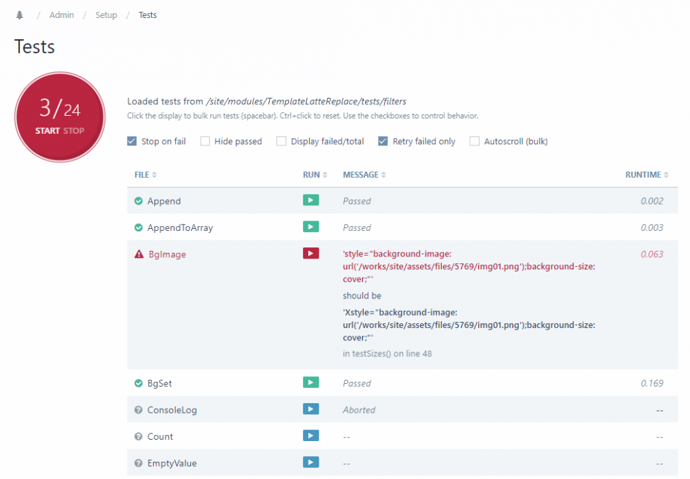 ProcessNetteTester Run Nette Tester tests within ProcessWire admin. (continued from here) Features AJAX interface for running Nette Tester tests, in bulk or manually display counter, error message and execution time in a table run all tests at once or launch single tests show formatted test error messages and report PHP syntax errors stop on first failed test (optional) hide passed tests (optional) display failed/total instead passed/total (optional) re-run failed tests only (optional) auto scroll (optional) include or exclude tests based on query parameters start/stop all tests with the spacebar reset one test or all tests (ctrl+click) TracyDebugger File Editor integration https://modules.processwire.com/modules/process-nette-tester/ https://github.com/rolandtoth/ProcessNetteTester
