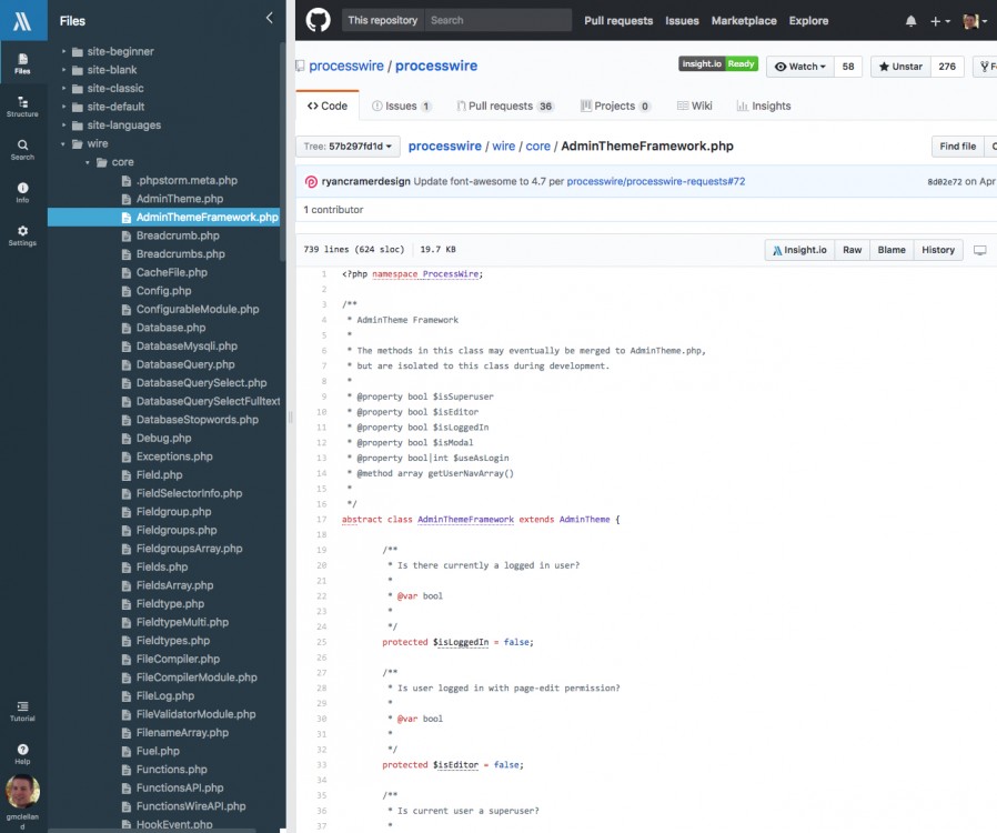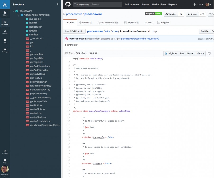 Just thought I would share this cool new chrome/firefox addon for https://insight.io that I discovered. It allows you to quickly search or view the folder/file hierarchy of a repository inside of github. It also allows you to list the methods of a class It's very similar to https://chrome.google.com/webstore/detail/octotree/bkhaagjahfmjljalopjnoealnfndnagc, but provides more features. On the github repo page it shows a insight.io button where you can view the current file on github that you are looking at on insight.io for more features like where specific functions are referenced. Note: I'm not affiliated with that company. I just thought it was helpful.