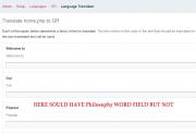 hi to all members! i use processwire 2.4 (my server php is 5.3) i try to translate my home template but i cant get all the translatable fields in admin, for example in the folowing code i dont get the "Philosophy" word for translate, and this happens in the other words to and to all other templates <h4><?php echo __("Our"); ?> <span><?php echo __("Philosophy"); ?></span></h4> here is an image of the field not there any idea why this might happen, thank you!