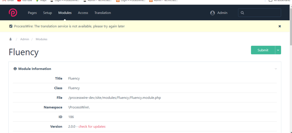 Hi, We added the Fluency Module and installed it in our ProcessWire setup. We have two languages: Default and Tamil. We are using the "Google Cloud Translation" engine in the Fluency Module and have added the Google Cloud API key. However, we are seeing the following message: "ProcessWire: The translation service is not available, please try again later." (Please find the attachments below.) Could you please suggest how to proceed further?