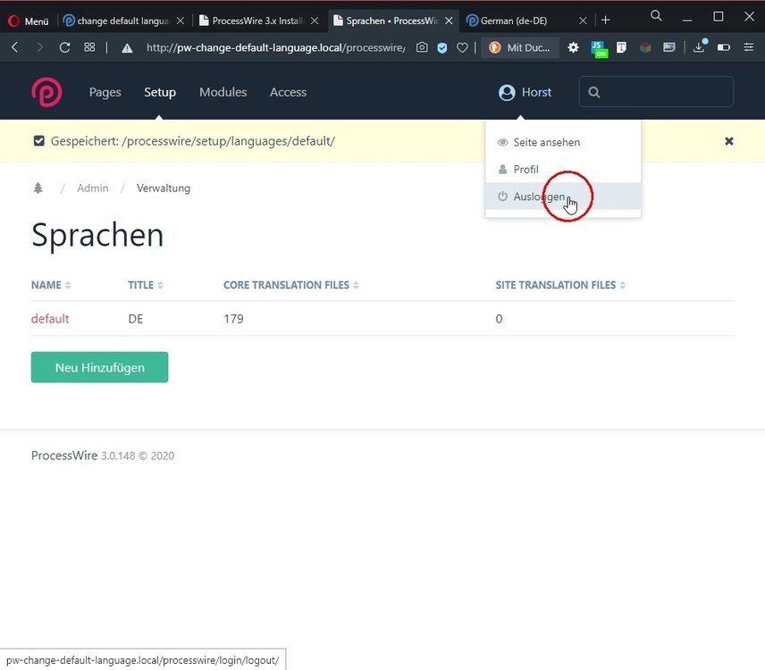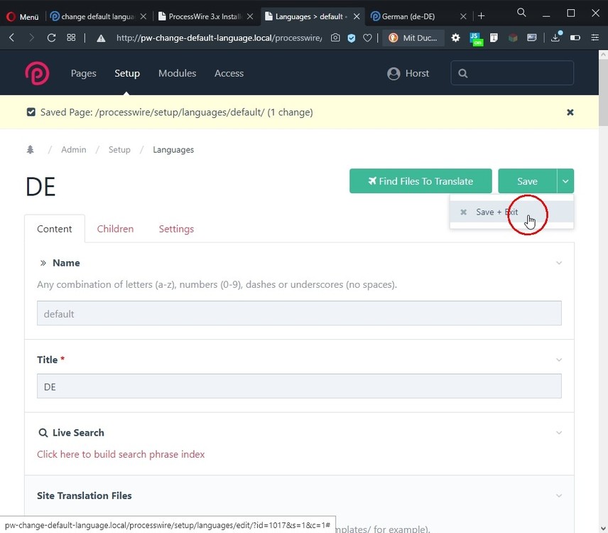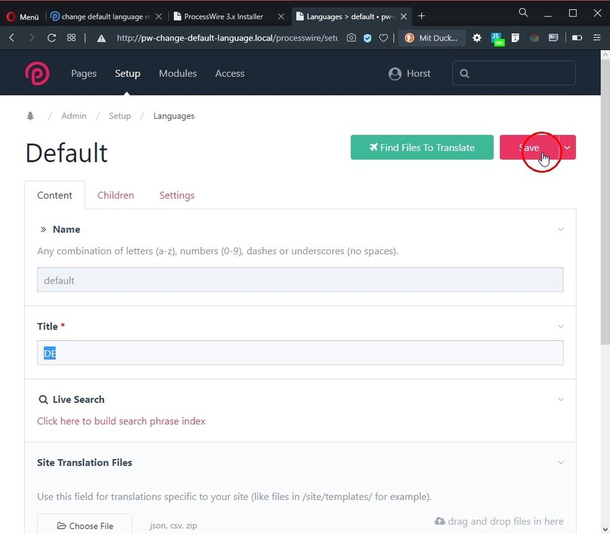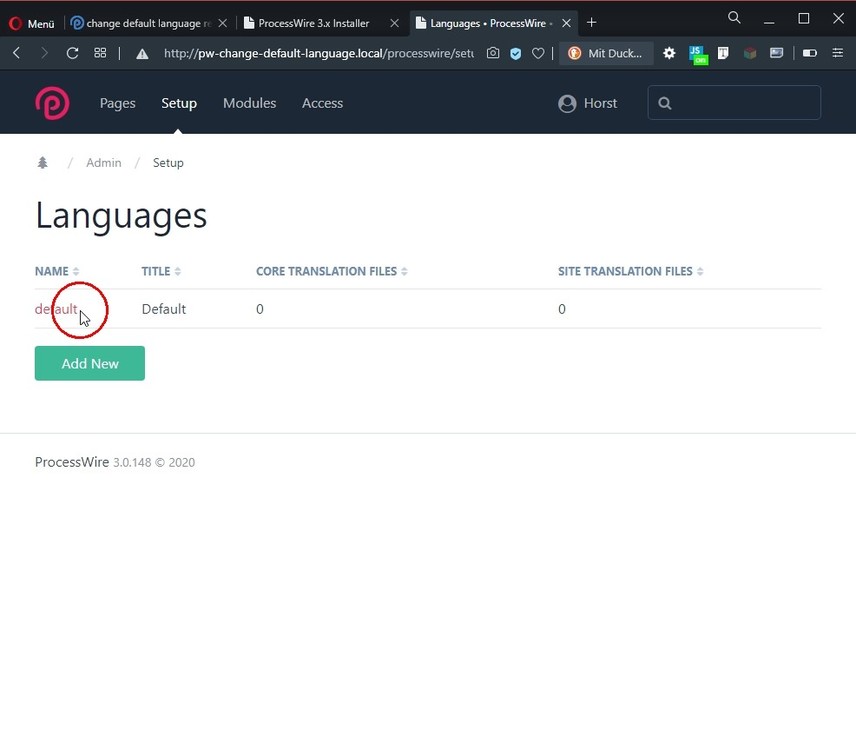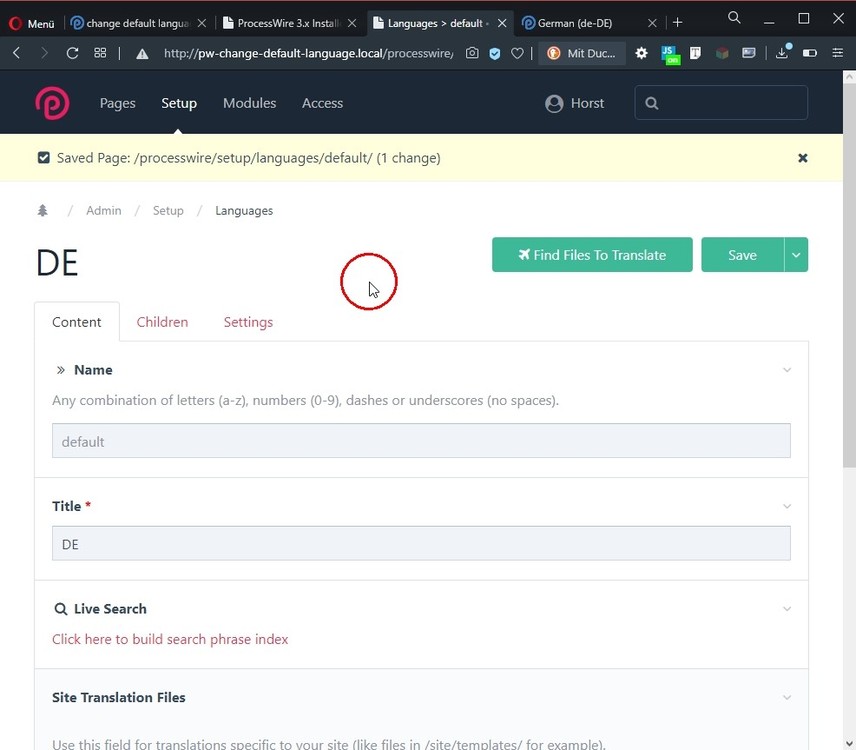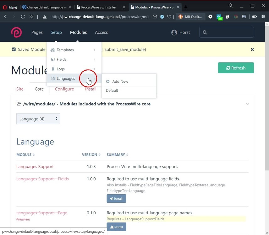 Change Default Language to be None-English | Walk Trough When you start a new (single) language site and the default language shouldn't be English, you can change it this way: Go to the modules core section: Select the Language ones by the filter function: We have four language related modules here, but for a single language site in none english, we only need the base module, named "Languages Support". So go on and install it. After that, you can leave it, ... ... and switch to the newly created Language section under SETUP: Select the default language Enter your new language name or its Shortcut and save the page. I will use DE for a single language site in german here as example: Now I go to the ProcessWire online modules directory, down to the subsection for language packs and select and download my desired (german) one: After downloading a lang pack as ZIP, I go back into my SETUP > LANGUAGES > default language page in admin, select the downloaded lang pack ZIP and install it: After the ZIP is uploaded, the files are extracted and installed, most of my screen is already in the new default language. To get all fully switched, we save and leave that page, ... ... and completely logout from the admin. Now, of course, we directly login back, ... ... and see, that now also the cached parts of the admin have switched to the new default language. ? That was it for a single language site in none english. If you want to have a multi language site, just add more languages to the SETUP > LANGUAGES section. When using a multi language site, I think you also want to use multi language input fields, and maybe different page names for your language page pendents. If so, you need to go into MODULES > CORE > filter LANGUAGE and install what you need or want to use of it, (if not already done). Thanks for reading and happy coding, ?
