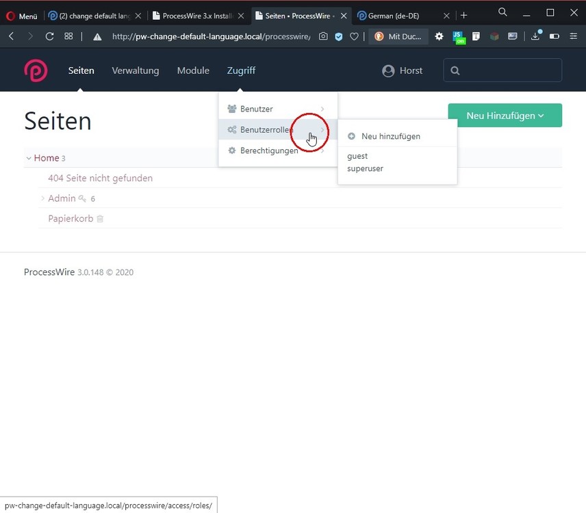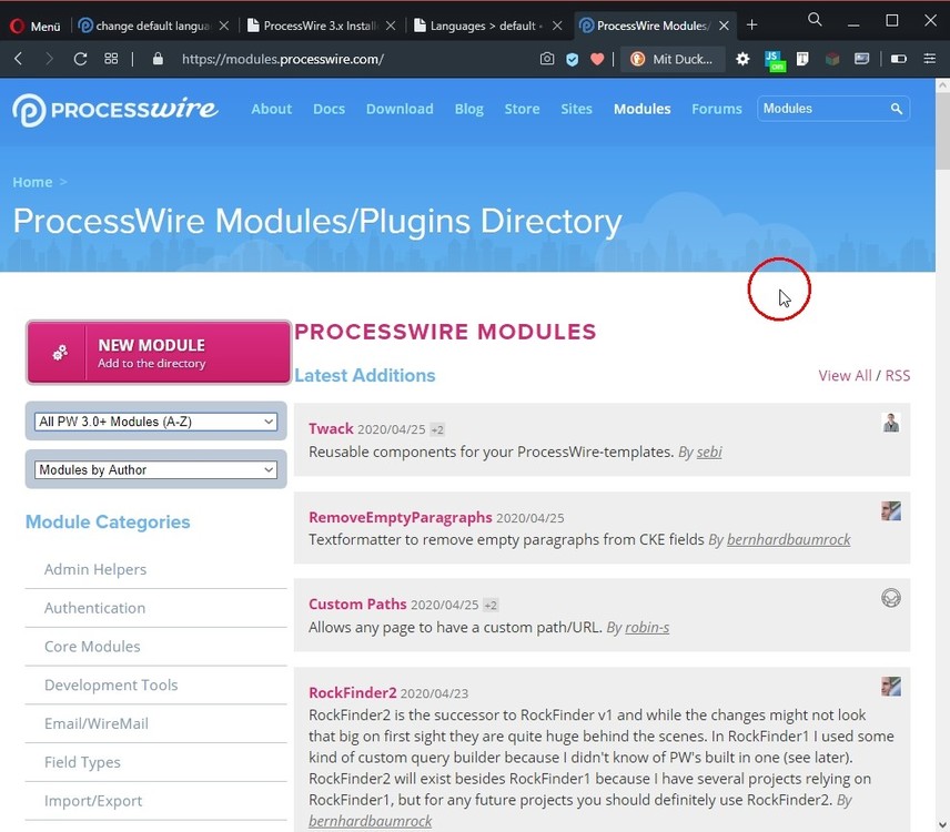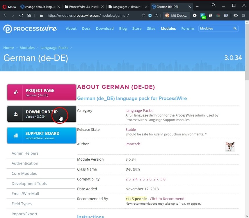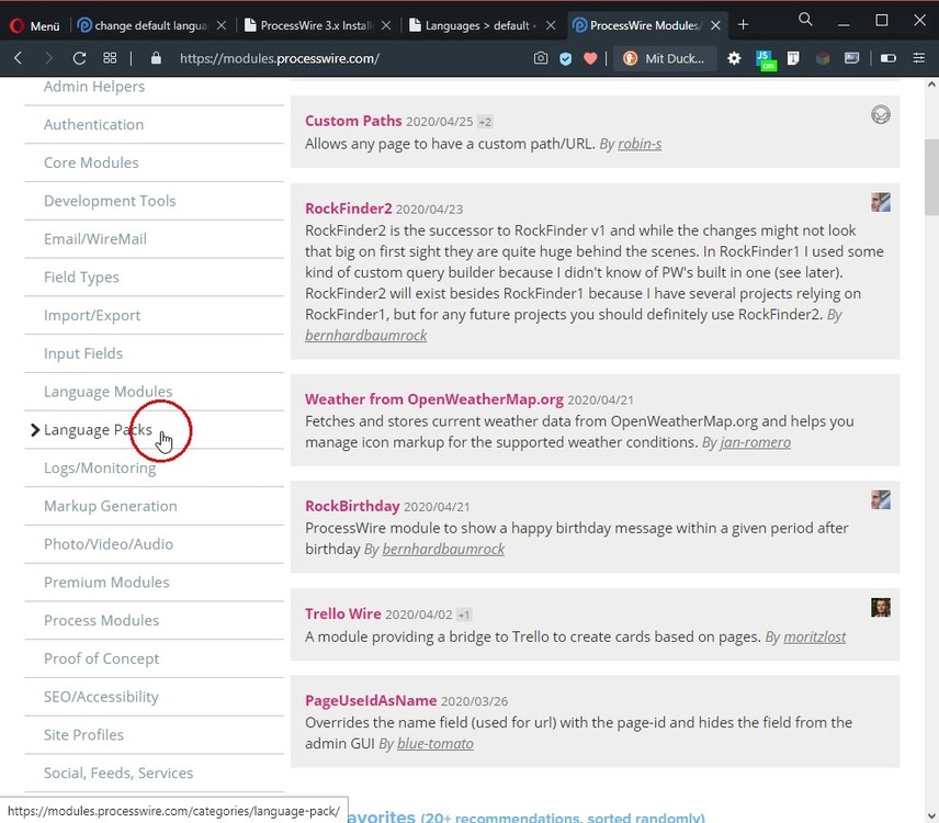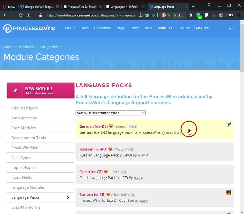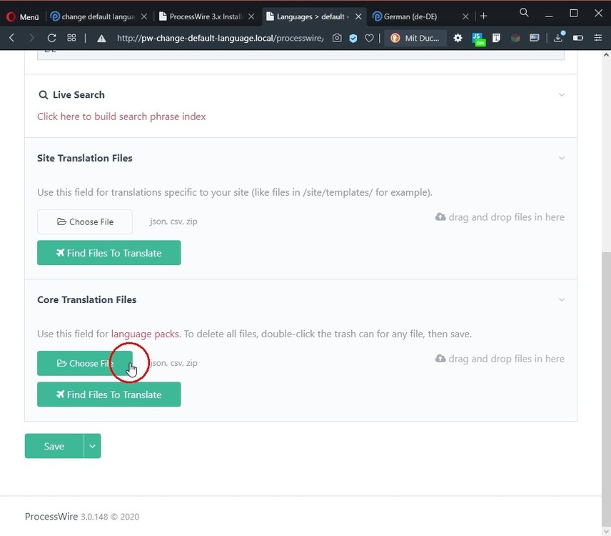 Change Default Language to be None-English | Walk Trough When you start a new (single) language site and the default language shouldn't be English, you can change it this way: Go to the modules core section: Select the Language ones by the filter function: We have four language related modules here, but for a single language site in none english, we only need the base module, named "Languages Support". So go on and install it. After that, you can leave it, ... ... and switch to the newly created Language section under SETUP: Select the default language Enter your new language name or its Shortcut and save the page. I will use DE for a single language site in german here as example: Now I go to the ProcessWire online modules directory, down to the subsection for language packs and select and download my desired (german) one: After downloading a lang pack as ZIP, I go back into my SETUP > LANGUAGES > default language page in admin, select the downloaded lang pack ZIP and install it: After the ZIP is uploaded, the files are extracted and installed, most of my screen is already in the new default language. To get all fully switched, we save and leave that page, ... ... and completely logout from the admin. Now, of course, we directly login back, ... ... and see, that now also the cached parts of the admin have switched to the new default language. ? That was it for a single language site in none english. If you want to have a multi language site, just add more languages to the SETUP > LANGUAGES section. When using a multi language site, I think you also want to use multi language input fields, and maybe different page names for your language page pendents. If so, you need to go into MODULES > CORE > filter LANGUAGE and install what you need or want to use of it, (if not already done). Thanks for reading and happy coding, ?