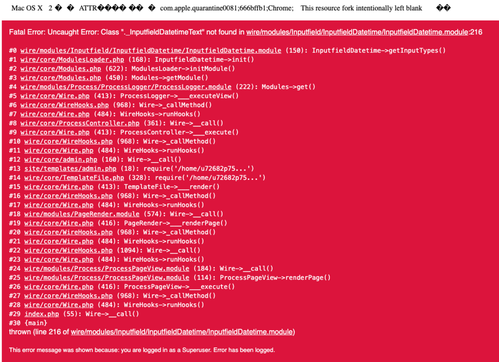I just upgraded a 3.0.210 version PW website to the latest master (3.0.229). I renamed the old wire folder, replaced it with the 229 version, and went into the admin panel. After a few update messages and refreshes, all seemed fine. Pages are loading properly and can be edited as usual. However whenever I now try to view any log or message under setup, and also certain fields, I'm getting the following error: Fatal Error: Uncaught Error: Class "._InputfieldDatetimeText" not found in wire/modules/Inputfield/InputfieldDatetime/InputfieldDatetime.module:216 I'm not sure what's wrong here, the ._InputfieldDatetimeText file seems to be present. Is this a bug?